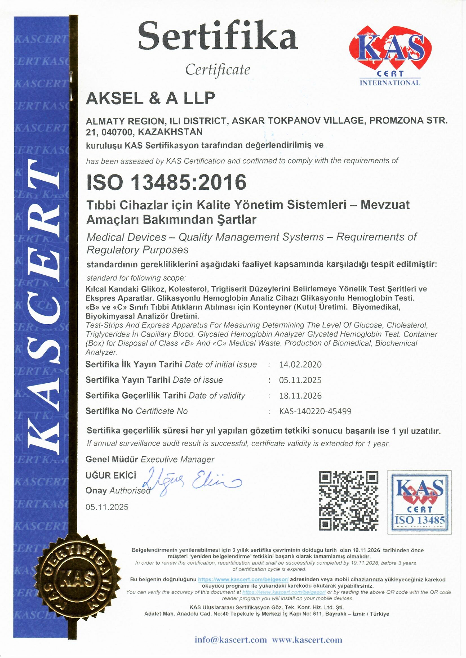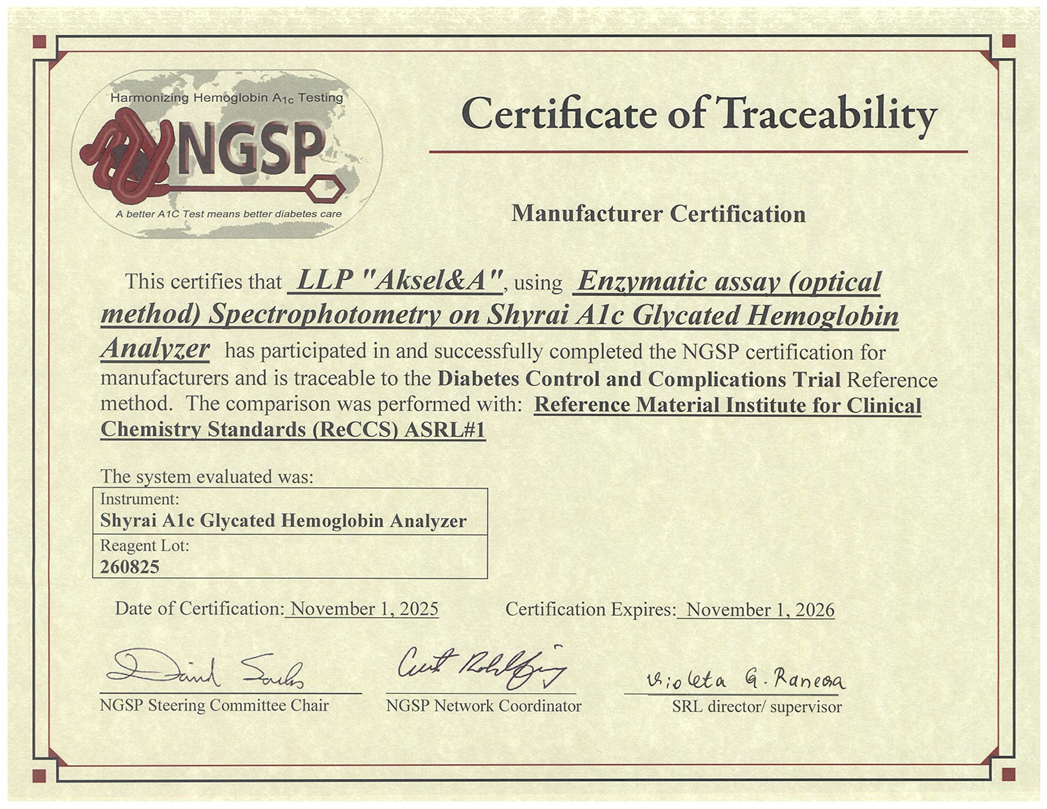 Первый и единственный в Казахстане производитель тест-систем на гликированный гемоглобин, подтвержденный международным сертификатом NGSP.
